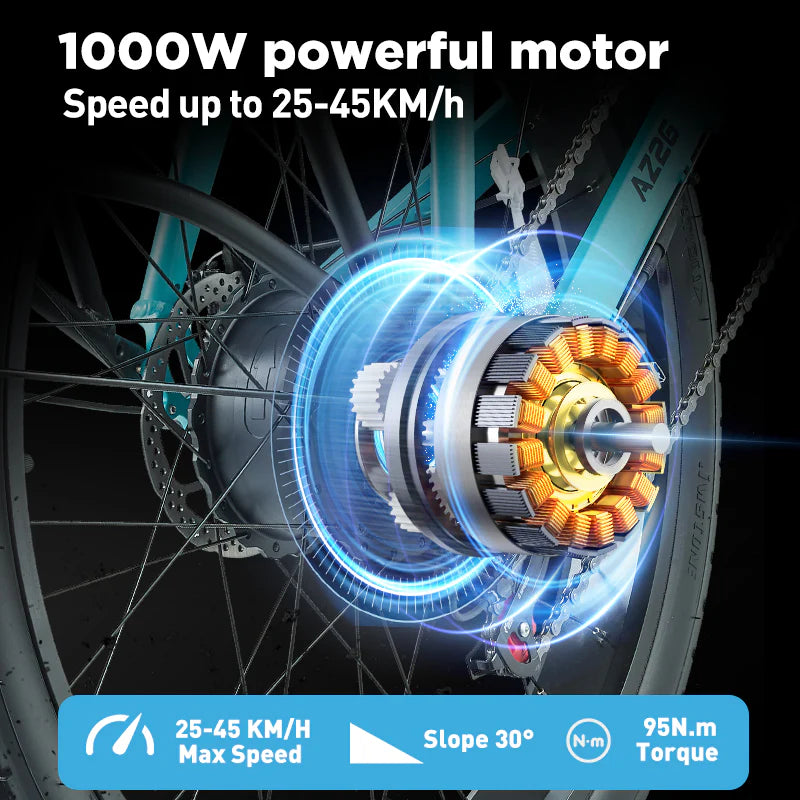 BURCHDA AZ26 is powered by a 1000W high-capacity DC brushless motor, providing superb power with a maximum speed of 40-45Km/h and a maximum torque of 95N.m. Whether you're on the hills, slopes, or a long-distance trek, this high-efficiency motor will provide you with great power!