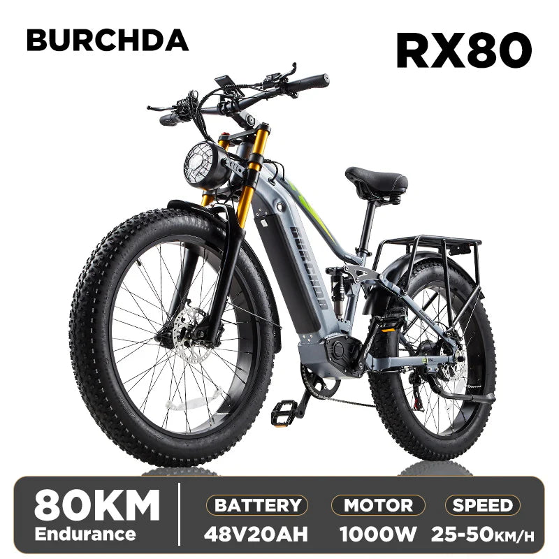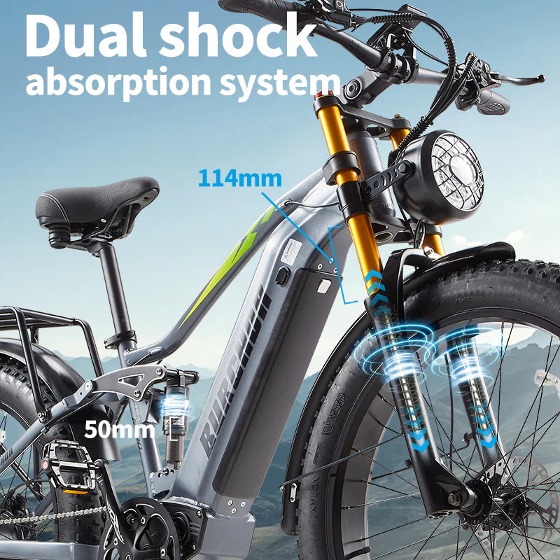 BURCHDA RX80 is equipped with front and center dual shock absorbers, riders can better control the stability and steering agility of the e-bike, keep the body stable and reduce the risk of falling, in the bumpy road, the shock absorber can absorb more impact, reduce the frame, battery and other components of the frame and the risk of wear and tear and damage.